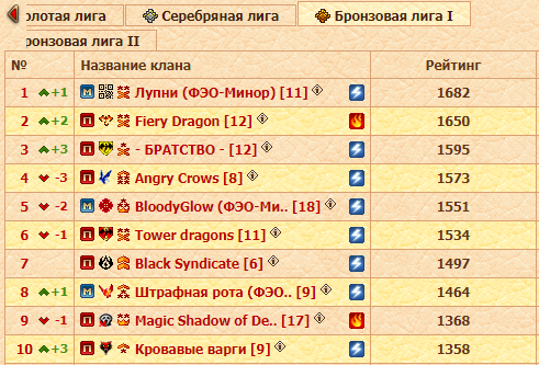На прошедшей неделе устоявшееся положение в лигах прилично пошатнулось. Первой сенсацией стало смещение Laurus strages с их привычного места, пока лидирующую позицию в Золотой лиге занимают Dune. Третье место уже привычно закрепилось за Дикие Сердца, а вот ниже топа-3 происходят постоянные рокировки, тем более что там наращивают преимущество solo hard! Да и в других лигах иногда кланы отделяют друг от друга лишь несколько баллов, чего однако не скажешь о Черепашки, которые свое первенство в Бронзовой лиге II уступать, кажется, не намерены никому.