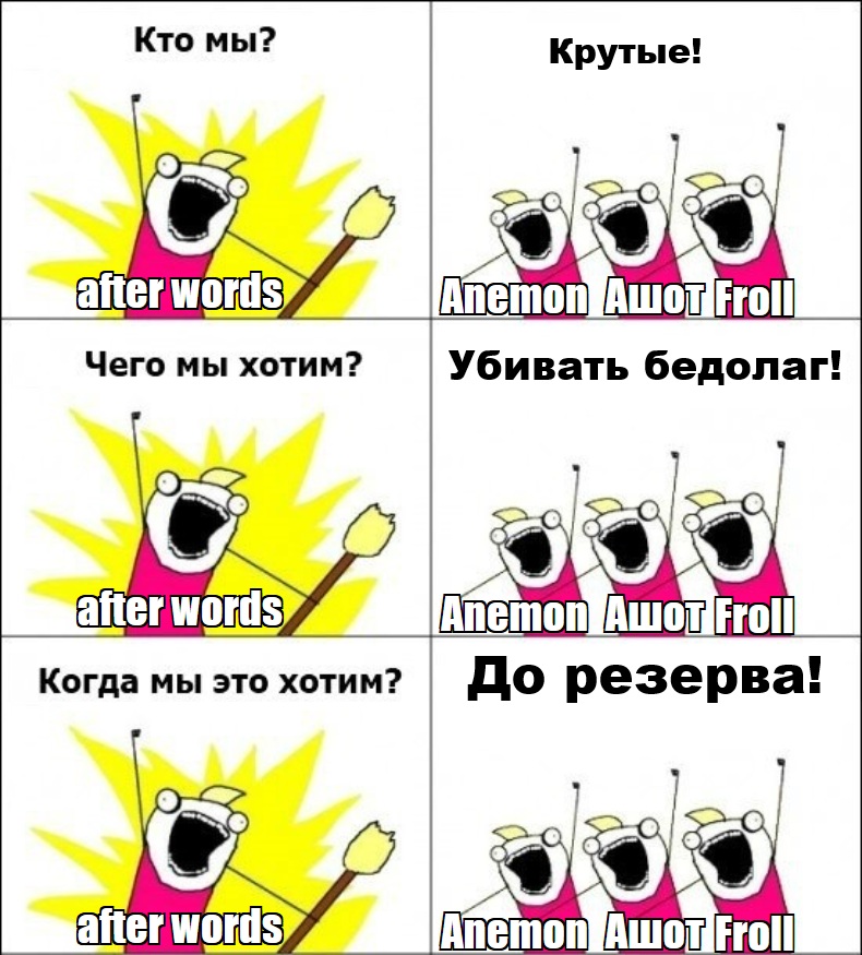 Всегда кстати: У вас же цензура :) Хочется, чтобы на физ. КВ Администрация перестала экспериментировать, меняя количество стаков, или отменяя какие-то решения, на которых в том числе строилась тактика. Неизвестно, как сложились бы КВ в лигах, если бы, например, у нас не забрали (или кто-то наныл) бы отвары восстановления, которые мы скупали еще с лета, и у большинства соклан было по пять отваров. У меня был самый долгий бой на этих КВ, который я просидел от первого до последнего удара, сейчас после почти полутора месяцев могу сказать, что, наверное, такой затяжной бой меня не смутил, но дольше я точно не хотел бы сидеть. Что касается наград за КВ, пора им уже перерасти во что-то большее, чем перстень на инициативу и плюс к голде на фарме.